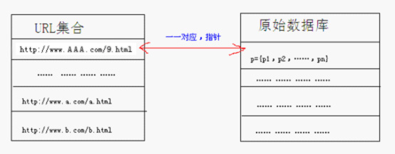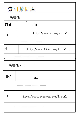 如果http://www.AAA.com/9.html页面被切词成p={p1,p2,p3,……,pn},则其在索引数据库中由上图方式体现。